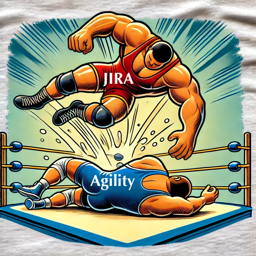 I was scrolling LinkedIn when I saw a picture of Jira executing a wrestling splash on Agility. It triggered a train of thought about the place for tools like Jira in the context of distributed teams that span different time zones and on which the team members often have to split their attention into multiple projects.